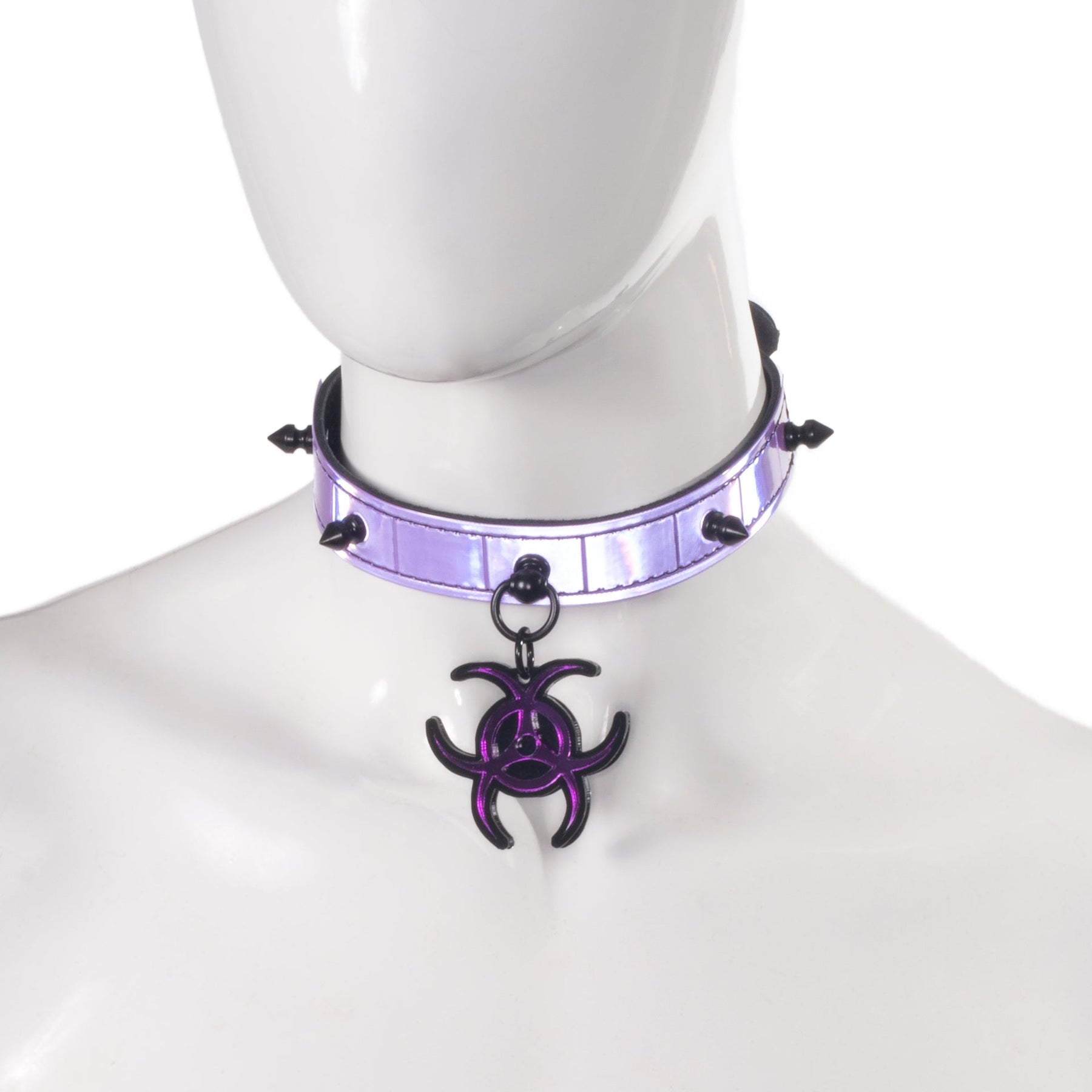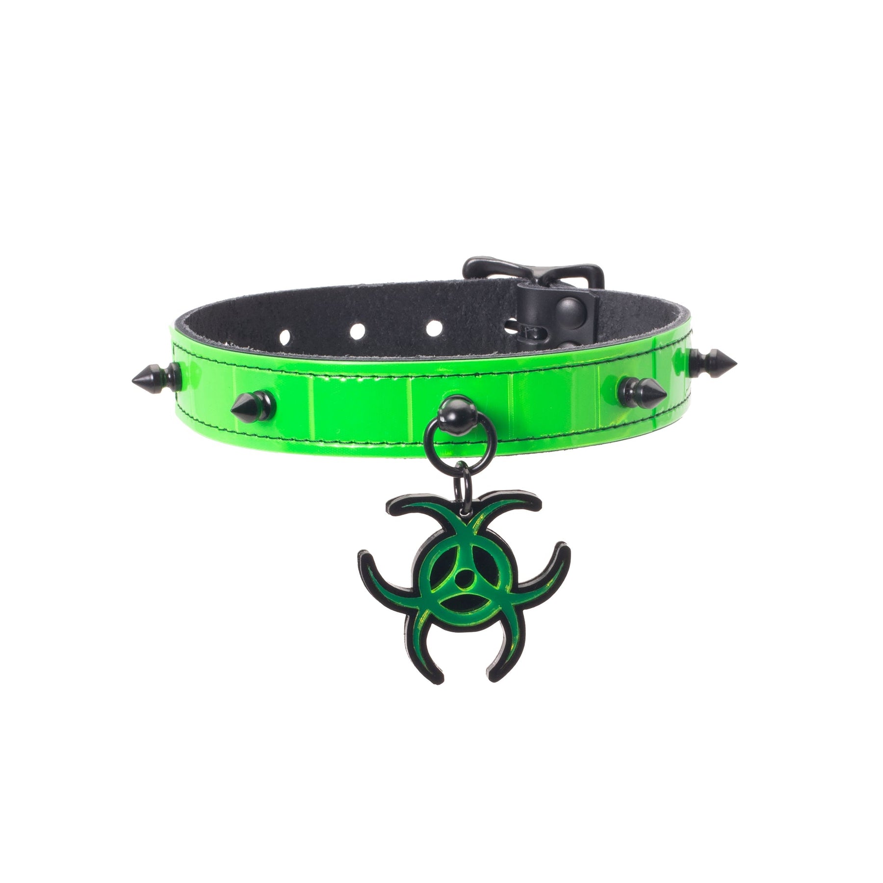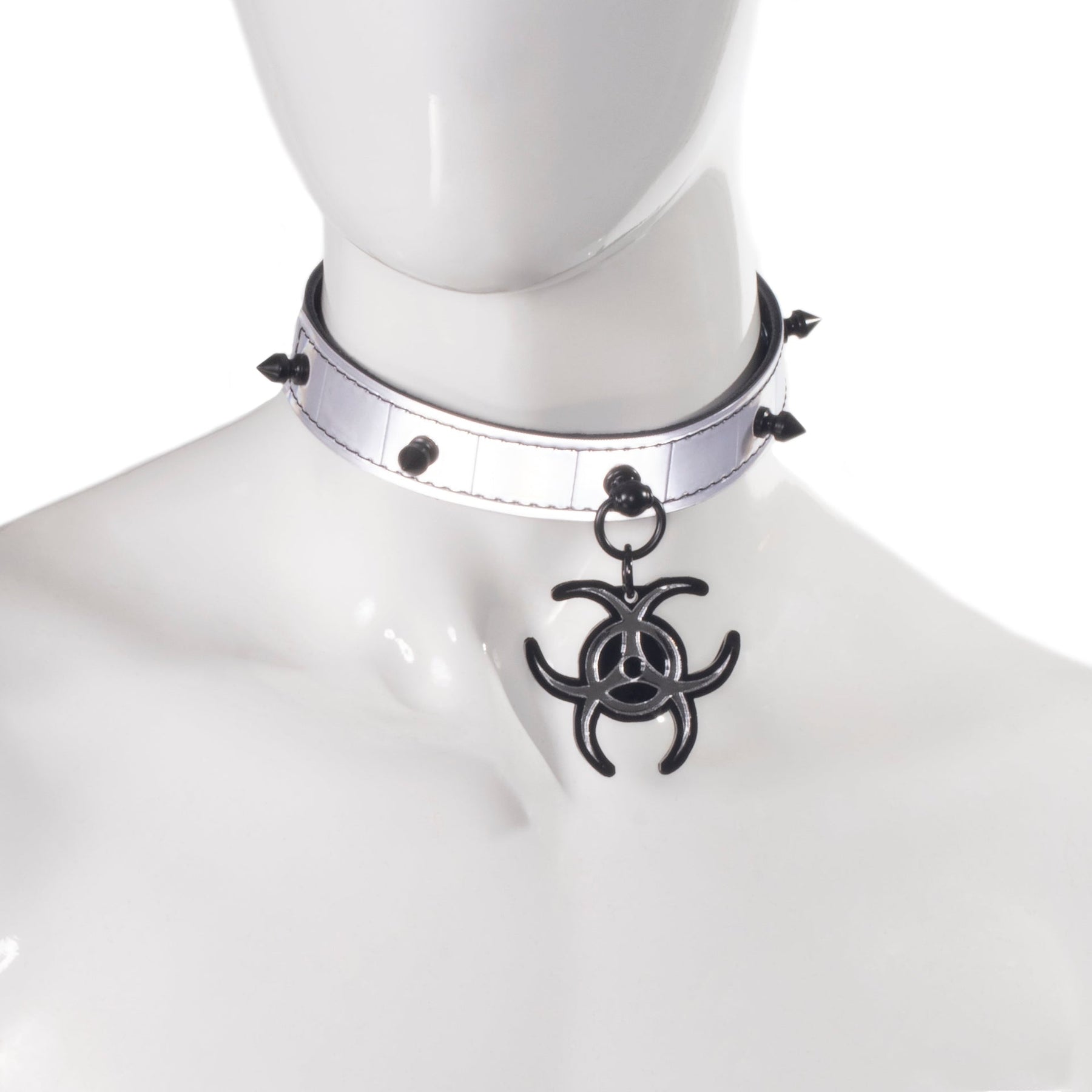 A DSF original, these hyper reflective collars come with a thick laser cur acrylic charm. Yellow, green and orange have UV reactive charms, all other charms are reflective mirror. The collar itself is made from our top grain leather, soft comfy and durable. The reflective tape has been sewn on for durability and flashes light back at any light source. Finished off with matte black metal hardware.